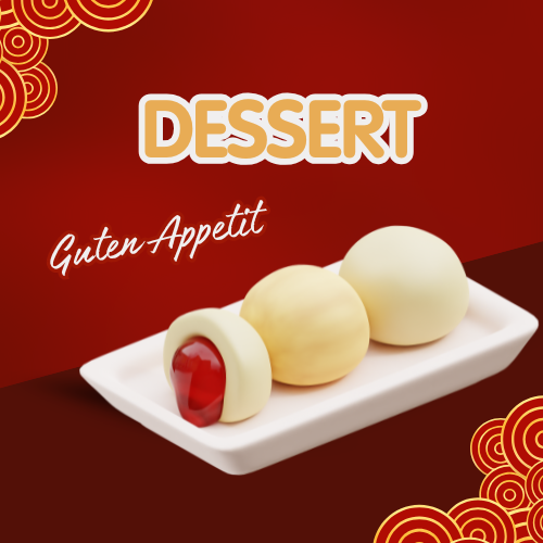 Gebackene Klebreis-Kokosbällchen Schokoladensoße / Erdnuss / Sesam