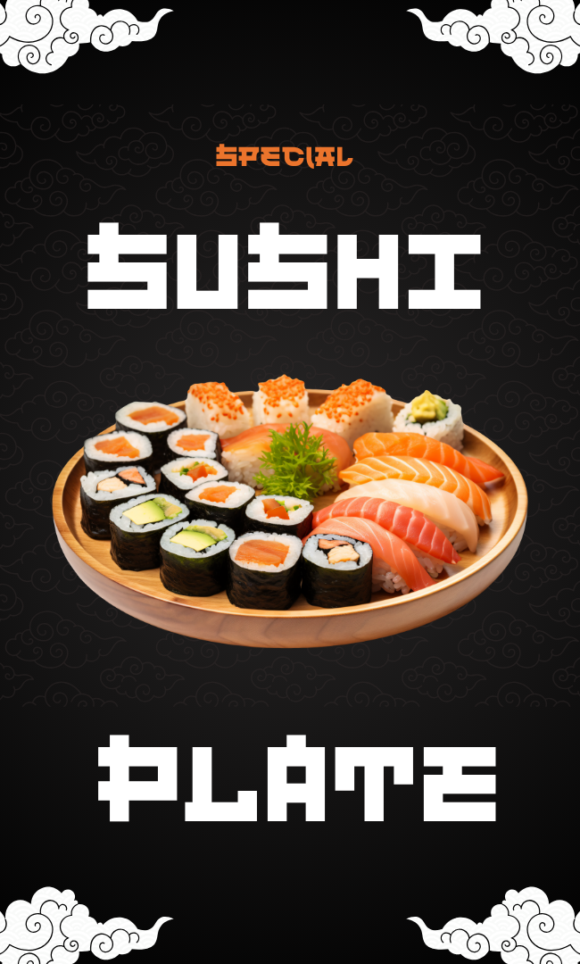 3 Vorspeisen nach Wahl (N° 1 – N° 27) & 12 Nori Maki: 6 Sake, 6 Tempura Ebi Maki & 16 Inside out Maki: 8 California, 8 Salmon Skin & 6 Big: Salmon Maki & 6 Nigiri: 2 Ebi, 2 Maguro, 2 Sake &Sashimi: Lachs,Thunfisch & 1 Dessert: nach Wahl N° 221-N 224
